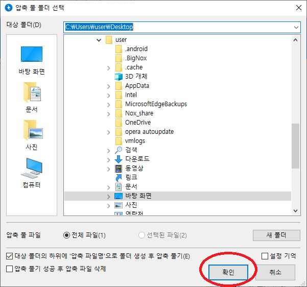 3.저장할 곳을 지정해준 다음에 확인을 눌러줍니다.